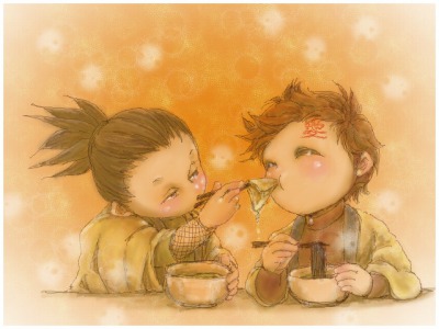 それぞれタヌキ蕎麦とキツネうどんを食べていますが、シカマルは自分の油揚げをあげちゃうよね~♪
