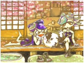 気が早い…けど、立春に描きたくなった、春待ち、里帰りシオカラーズ。 人間界でのライブも成功し、じいちゃん家でマッタリくつろぐ二人と、縁側日向ぼっこに是非お供してほしくて、ジャッジくんも投入~♪ アタリメじいちゃんは、司令の仕事で忙しくて不在です。 しまった!カラータイツをはかせ忘れた!