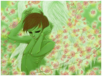 背中から蔓が爆発的に萠え出て無数の小花が咲き乱れる…というイメージでしたが、勢いが足りないし、羽根はやっぱり余計だったかも…なんだかわかんないし…でも描きたかったので満足です♪