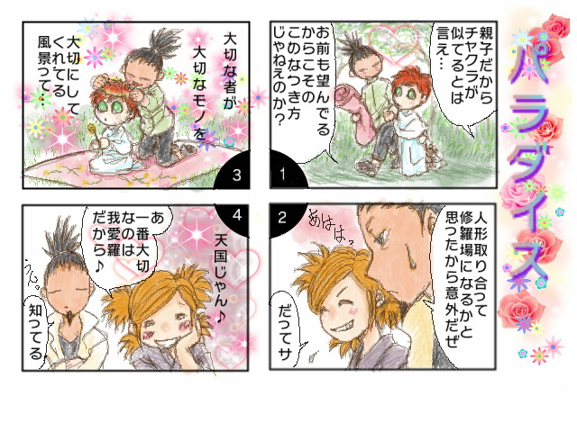 テマリのセリフは魂の声です。 2次創作する動機であり報酬であり生きるエネルギーです。 3コマ目を延々描きたい欲求が… ウチ(脳内)の皆さんは全員、我愛羅が大好きです♪ 多分、3コマ目で一枚絵を描く…ちょっと構図が難しいので、(二人の表情やしぐさを巧い具合に入れ込むのが)しばらく悩みますが、それすら楽しい♪