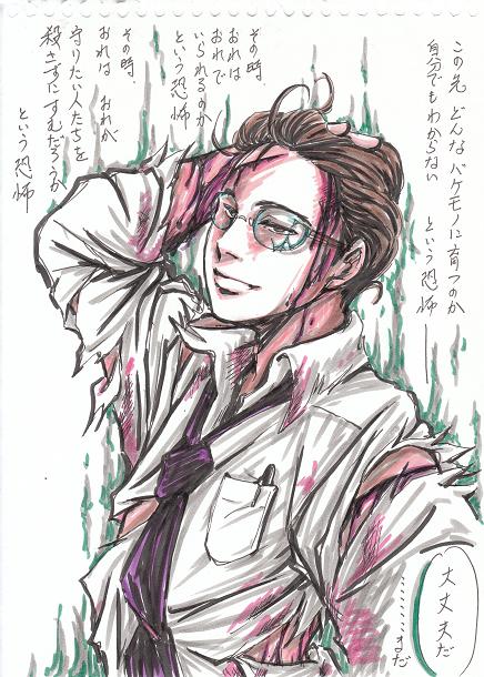 オリジナル。 夜光の女房役、黒髪のヤツ、本名はさとし。仕事上の呼び名は闇夜風。 クロッキー帳にラフ描いてたら、モノクロならこのままでもイイか、とか思ってペン入れて、図に乗って色まで入れてみた・・・ 楽チンでした・・・ 紙がクロッキーなので、あまり白くないけど。 キャラ転がし中の独り言なんで、いいか、と。 髪は黒です、オールバックの表現がむずいんで茶を使っただけです・・・<(_ _)> 髪型は普段は上げてません、メガネも常用はしてません。