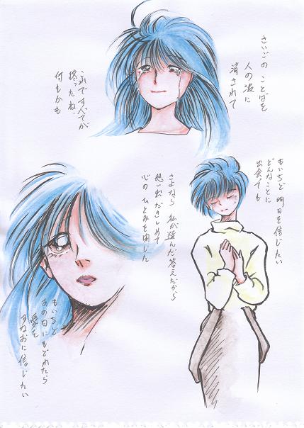 実験3枚目。 大体掴んだ。次回はちゃんとした紙にやる。 ・・・ダイソーのスケッチブックは、もの凄いストレスで、何度も挫折しそうになった・・・ 紙だけはいい紙じゃないと・・・ 白く見えても、材が悪いのか、濡れるとマダラになります・・・ 乾けばまた白くなるんだけど、描いてる最中の楽しみが拷問に・・・ やはり、文字は岡村孝子の曲です、抜粋です。多分、絵のイメージ部分でしょう、あまり記憶が・・・ 仕事から帰ったら日記書く。書けたら。