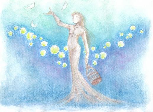 最初に出たイメージは背景の曲線で、ソレと交差するラインに人物を配そうと思って、ボンヤリ考えて、上方へ抜けるポーズを選んだらこうなりました。 鳥本体を入れようかと思ったら無理があったので、飛び立った名残の羽根だけ入れました。 テーマは描いてる間に降りてきて、宮沢賢治の「永訣の朝」でしたか?たまさか視界に入ったのでそこから頂きました。 全体的にもっと濃い色のイメージでしたが、覚悟が無くて進められず・・・ 気が向いたら進めるかも・・・