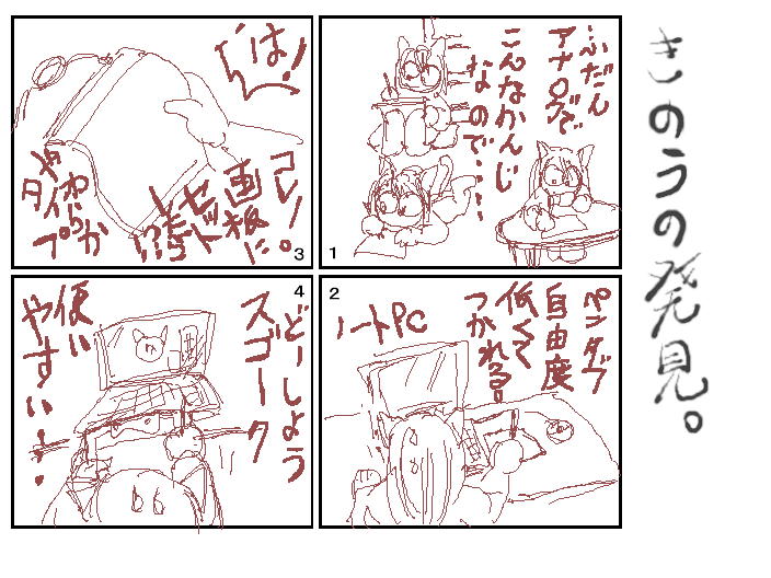 コレが新発見! このスタイルで描いたのが先のニーナです。 すごいわ・・・わたしの進化を押し進めるモノは、 「上手くなりたい!!」という情熱ではなくて 「楽したい、楽しみたい♪」という煩悩です!! ついでに4コマのフォーマットも作ってみた。 この2×2タイプと縦型と。 人様の4コマ見て、また描きたくなりました♪