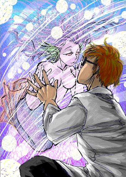描きながら色のセレクトが、アナログではあり得ないモノに推移していくのが、自分でも面白い・・・jamさんに習って、蛍光っぽい感じを入れ込みたくて、尾鰭や髪などに明るい色を入れてみた、あとから入れられるのもデジタルならでは。