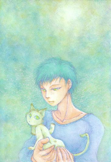 水張りパネルのままスキャンして、白い柄だけデジタルで描きました。 当初のイメージではもっと暗い青だったのですが、相変わらず踏み込みが甘いのと、あんまり暗いと可哀想だなと思っちゃって・・・ やはり当初は一人だったんですが、さみしくて可哀想になって、以前飼ってた白猫をイメージして寄り添わせました。 もう少し、塗る予定です。