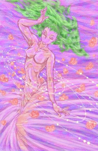 ダンサブルな女神から展開して、描いてみました。 手とかポーズとか全然違うけど、受けた印象を転がして、踊って貰った。 楕円の効果とか花は、この絵用ではなく、別にボンヤリこんなのどうだろう・・・と、説明会開始前の数分でメモしたモノを行き当たりばったりで実験。 R・・・要らないと判断する。 やっぱり胸より前鋸筋と肋骨の方が好き・・・そこが描きたい・・・