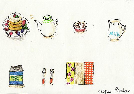 「手順式 1日10分で絵がうまくなる水彩画ドリル」著:吉沢深雪 より。ティーセットを一つずつ描いてみました。
