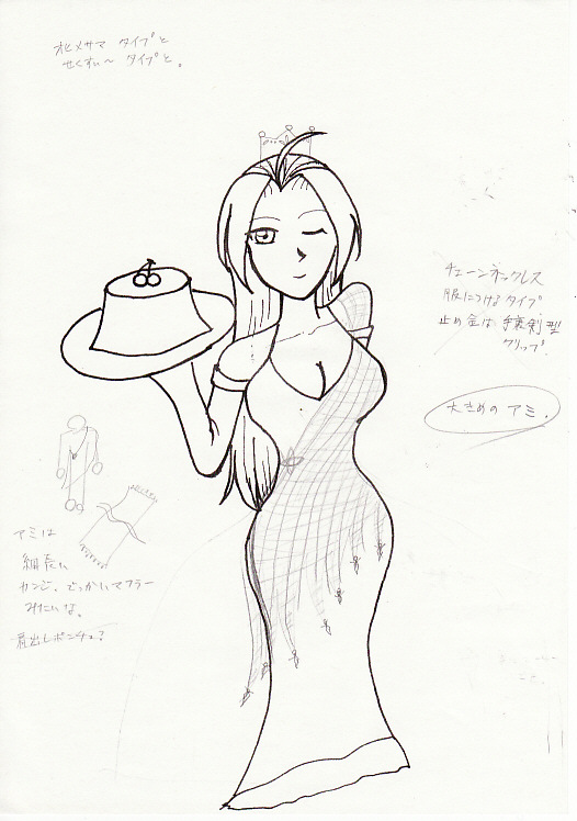 前回のルナ(仮)の色塗り前です。書いてあるメモに試行錯誤の後が見えますな。「手裏剣型クリップ」とか書いてるし。