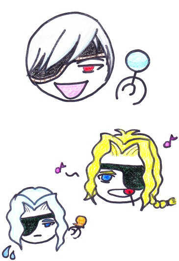 香織(一番上)から飴玉もらって、美味しく食べてるバルト(中央)と、甘いもの苦手だけどもらっちゃったから食べないのも悪いしどうしようと悩むシグルド(下)。みたいな。作中にはそんな設定、一切無いんですけどね。