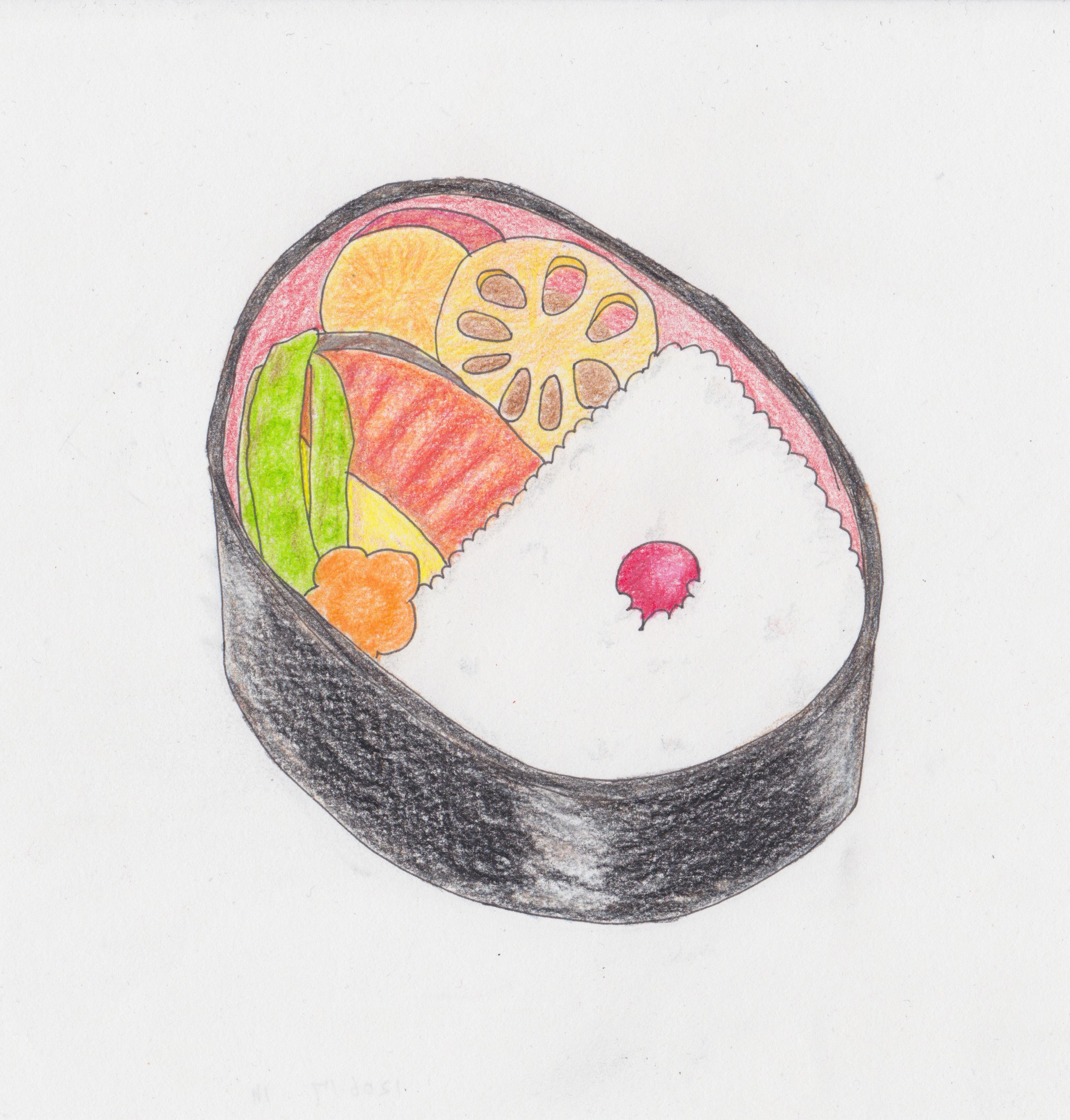「1日10分で絵がうまくなる色鉛筆ドリル」(by稲月ちほ)より、おべんとう。