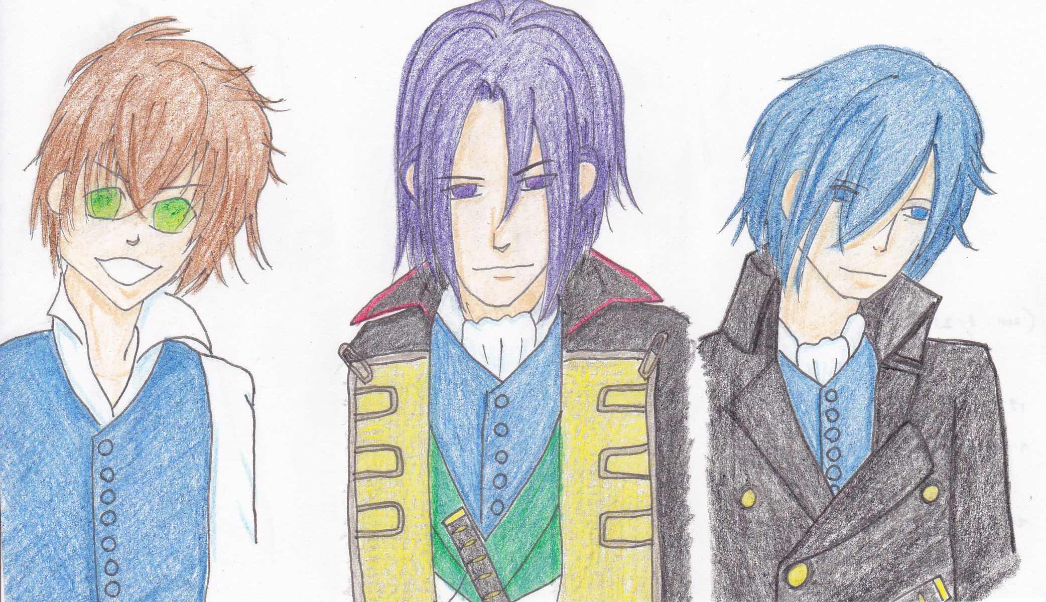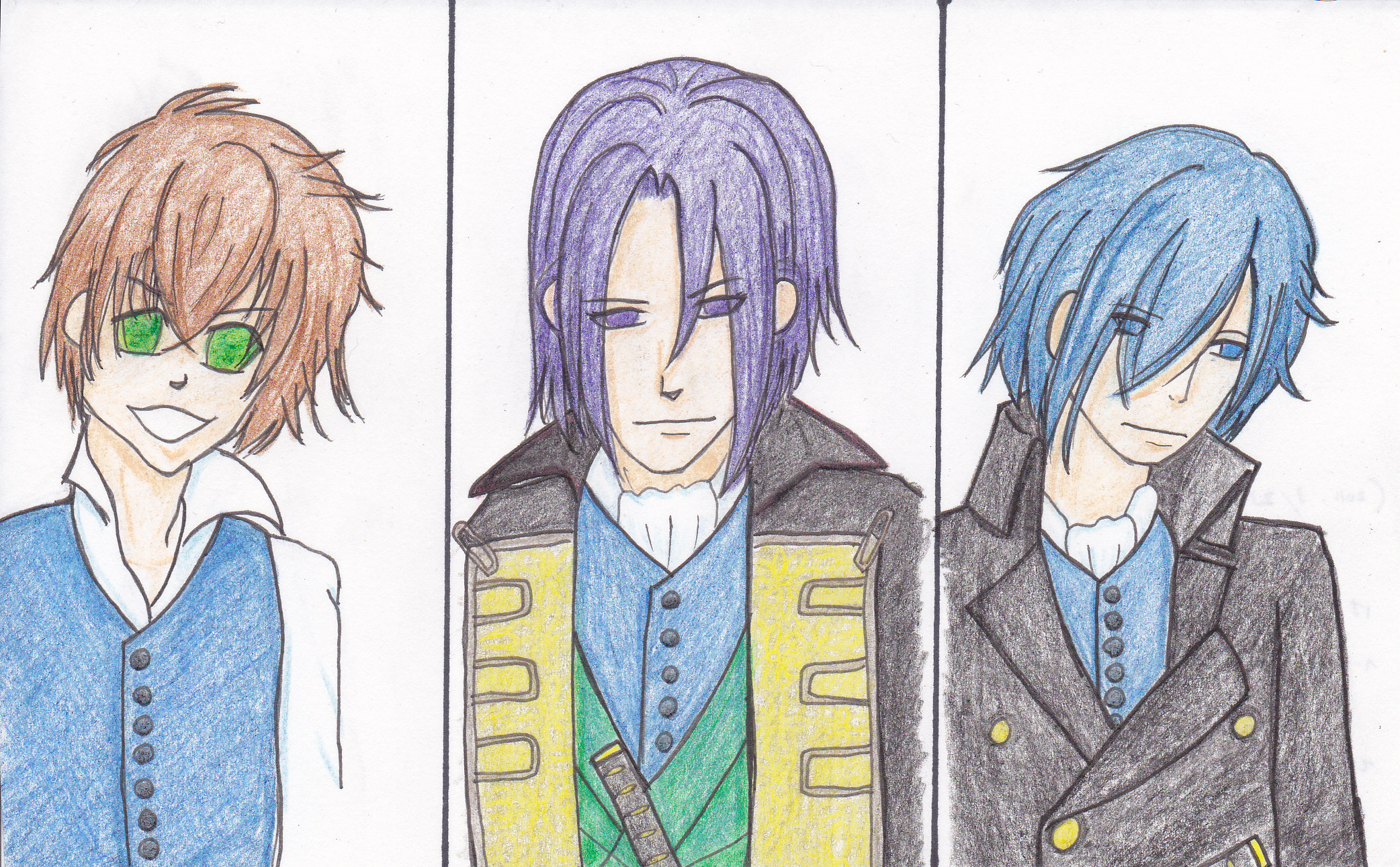 一枚目は「色鉛筆で塗ったまで版」で、二枚目は「さらにペン入れしてみた版」です。どちらも左から、藤堂平助、土方歳三、斎藤一。ネットで見かけた絵を元に描いてみたものです。