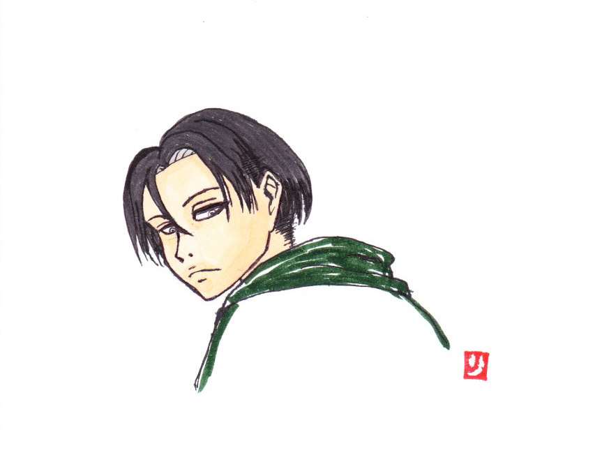 絵は「別冊少年マガジン2013年8月号」の右下にいた兵長を模写…してみたかったもの。今回はGペン(買っちゃった)でペン入れ+コピック彩色。