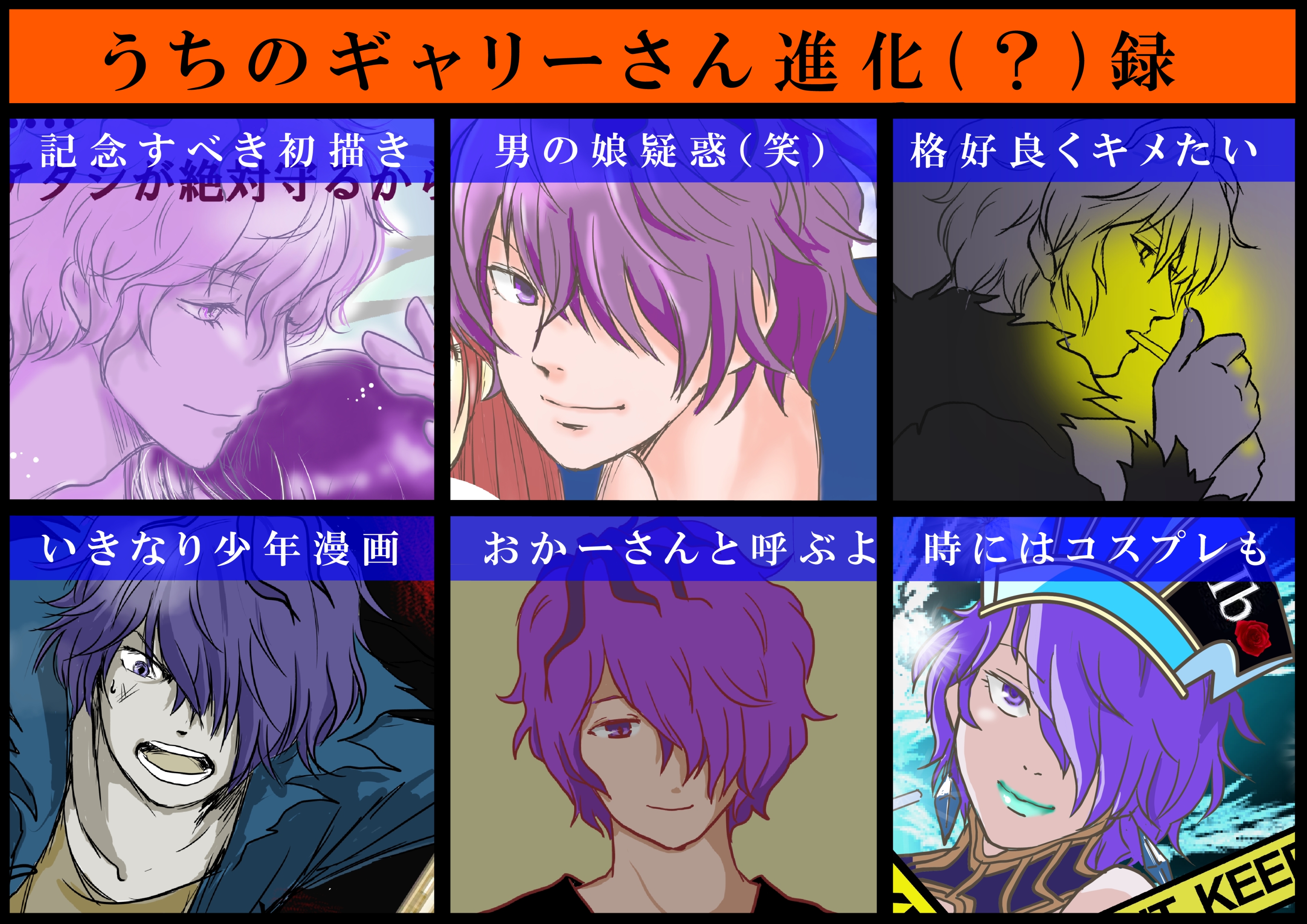 左上から→→→ 下の段で→→→ の順で見てください。 初めてギャリーを描いたのは5月だったんで、かれこれもう半年以上、彼と付き合ってるんですが……。 描く度に別人ってどーゆー事なの!? 並べてみたら、あまりに統一性が無くて、これはもう笑うしかないわ…(^_^;) まぁ最初っから公式に似せる気は無かったけど(オイ)、いい加減方向性を固定しようよ、私。 それにしても、全体が紫っぽい(笑)