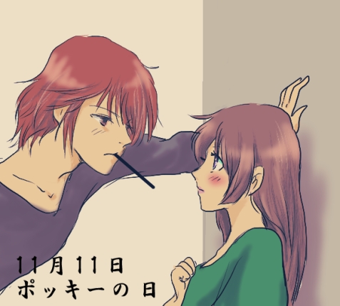 「恋に落ちた」お題で描こうと思ってた壁ドンだったけど、あまりに全国的に周知のものになってしまい、描く気が失せてお蔵入りしてたラフ絵に無理矢理ポッキー付け加えて着色してみました。