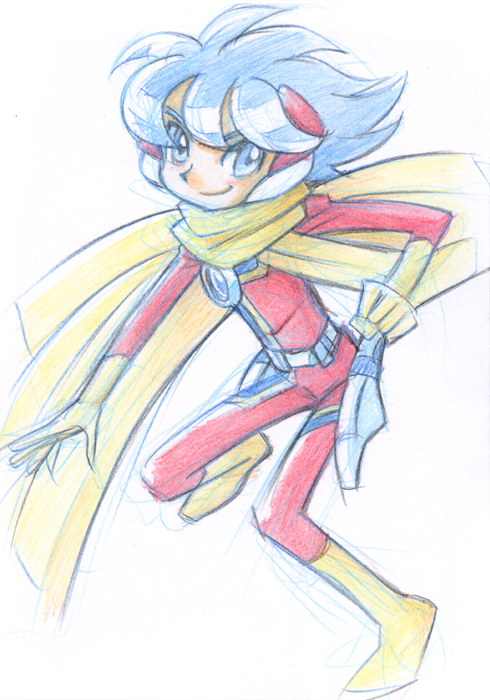せっかく12色あるのでもっといろいろ色を使おうということで、3原色キャラ、少年マフラーを描いてみました。 これも左右非対称のデザイン。 なぜ左右非対称が好きかというと、漫画でいろんなポーズや角度の絵を描いたとき、左右非対称なら体の向きがはっきりわかるから。 少年マフラーは、天才科学者(ついでにギーク)を父に持ついたって普通の少年(そんなこともないか)マコトくんが父親から無理やり押し付けられたスーパースーツをいやいや身に着けて、ご町内の平和をみだす悪者たちと戦うはめになるという少年スーパーヒーローものです。マフラーという名前はスーパースーツにマフラーがついているので、それをデザインした父親と、その姿をみたご町内の人々がそう呼んだから。本人は一回も自分からマフラーとは名乗っていない。