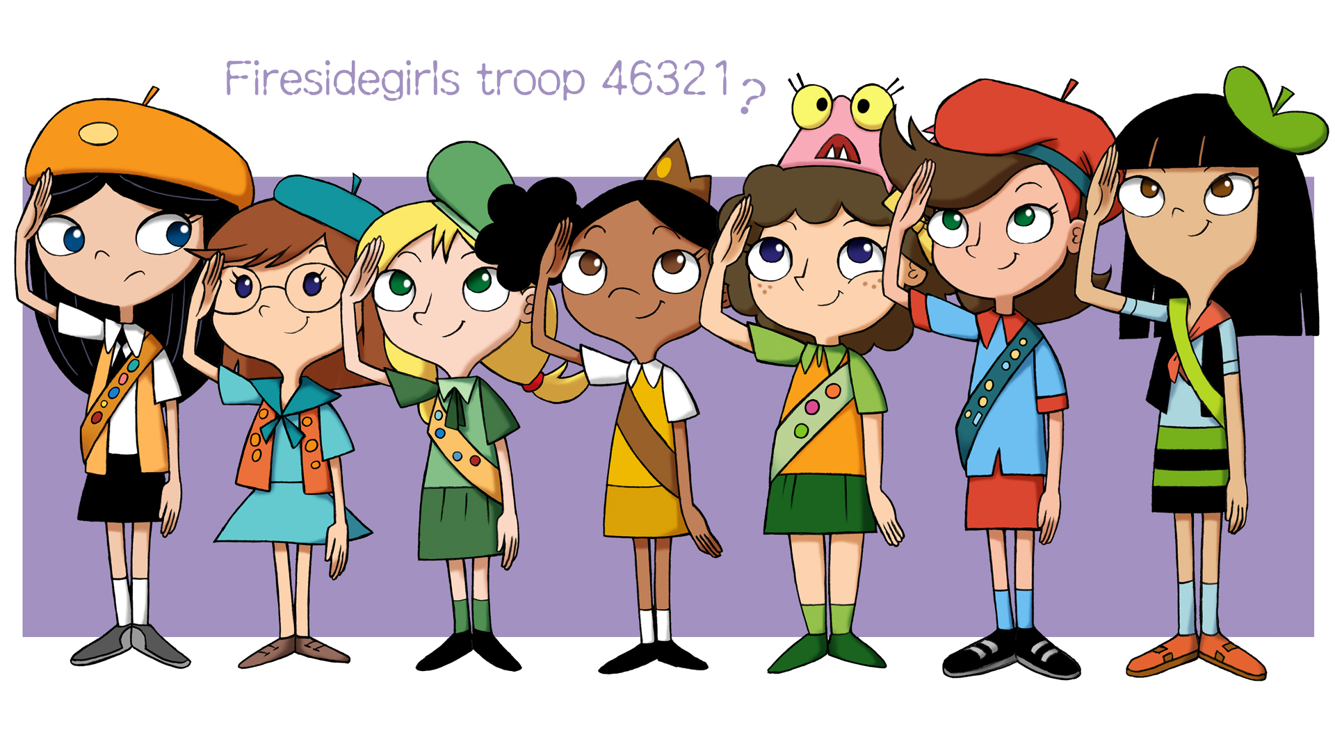 気になるのは、「フィニアスとファーブ」のスカウト、ファイヤーサイドガールズは、ファイヤーサイド夫人によって創設されたというエピソードがあること。これはファイヤーサイドガールズそのものがガールスカウトのパロディで、「フィニアスとファーブ」の世界では、ガールスカウトとはファイヤーサイドガールズのことであるという意味のようで、ファイヤーサイドガールズはヨーロッパやアフリカなど世界中に展開しています。