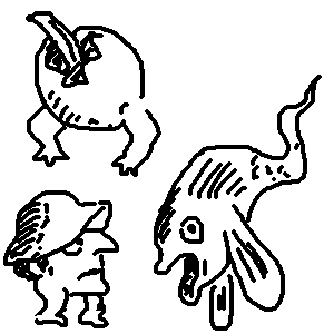 と、いうわけで、思い立ったがなんとやら。行ってきました諸星大二郎じゃなくて、ブリューゲル版画展。 終わり間際なためか平日なのに意外とお客さんが多かったなあ。 奇天烈なブリューゲルのキャラクターたちは意外とみんな小さかったのだった。版画だからあたりまえか。 そしてほとんどはまともな絵だった。これもあたりまえか。へんなおばけばかり描いていたわけではなかったのだなと。風景画にしろ、なんにしろ、とにかくみっちり書き込まれているので一枚の絵を見るのも時間がかかる。 当時の風俗画もあってそれも興味深い。 どこだかの村の縁日の絵では、ブリューゲル他数人の版画がならんでいるのだが、みんな絵のどこかに喧嘩してる人が描かれている。そんなに喧嘩すきなのか16世紀の人間は。風車や尖塔の上に的を置いて矢で射落とすというゲームも描かれている。イギリスでは今でもこのゲームをやってるクラブがあるらしいですな。 河があれば必ず船がある。やはり当時は物流の中心的なものだったんでしょうね。海の櫂船のように左右に何十本も櫂が突き出した船の絵もあったな。エンジンがないから河をさかのぼるのはやっぱり人力頼みだったんですね。 版画なので、ブリューゲルが描いた元の絵(素描)を職人さん(版作りの人も絵をかいたり、絵描きが版をおこしたり、明快な区分はないようですが)が版になおすんだけれども、その職人さんの技あってこそみたいなものも感じましたね。 特に多くの絵を版におこしているフィリップス・ハレ(だったっけ)がすごい。ぬめっとして、つるりとして、冷たくてやわらかいくせにほわんとしているけれど、くっきりとして、確かで、とんでもなく繊細で力があって美しい線。 黒べたが使えないので、影を表現するためには何重にも「かけあみ」の線を重ねていかなくてはならないのだけれど、それがまたとんでもなくすごい。精密機械のような線描写。今の日本の漫画界でもコレだけのかけあみを引ける人がはたしているだろうか、というくらい(たとえのせいであんまりすごさが伝わらなかったとしたら申し訳ないが)すごい。 いったい製作にはどれだけの時間がかかったのだろうか。 すごいすごいと書いてばかりでもなんなので、ちょっとちがったことも。 鳥がいいかげん。空を飛んでいる鳥。 犬もけっこういいかげんに描いているところもあるけれど、鳥はいいかげんだ。ブリューゲル以外の絵も同じような鳥の描き方なので、流行なのかなんなのか知らないが、けっこう適当に描いてるんじゃありませんかあれは。 でもその適当な鳥からおばけ鳥頭への変化もみられるので、そのへんはブリューゲルのすごいとこかも。(添付した冒頭の2つめのイラストを参照されたし) 展示会場の終わりには例によって関連グッズの販売ブースがあるのだが、いまいち欲しいものがなかったので、ガチャガチャ(けったいなキャラクターを立体化したガチャ)をやった。一発で欲しかったキャラ(冒頭に添付した最初のイラストを参照されたし)がでたので(といってもキャラは3種類だけなんだけどね)、これでいいや、と会場を後にしたと思ったら忘れてた。 常設の物品販売コーナーでエドワード・ゴーリーのうそっこタロットカード(すべての予言が悲観的なものばかりらしい)を売ってたんだよう。あ~買えばよかったかなあ。 ブリューゲルの版画やらデューラーの精密線画やらがあって、エドワード・ゴーリーの絵もあるわけなんだね。チョイ前のエントリでかいた、クリス・プリーストリーの本のデビッド・ロバートの絵もね。いろいろつながったところでこのへんで。
