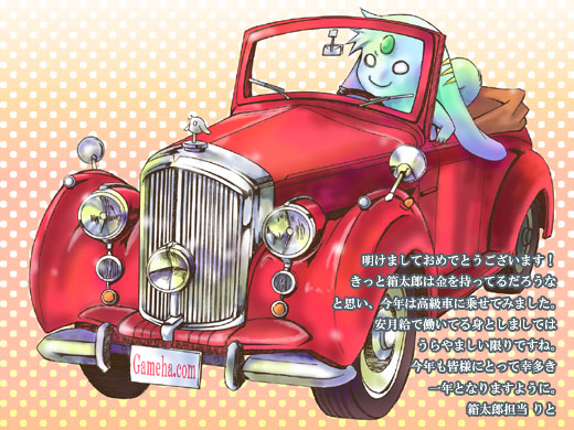 今年の箱太郎年賀は高級車に乗せてみました。きっと彼はお金持ってんだろうなー、とか思いながら…、くそう、こちとら家のローンでヒーヒー言ってるってのに。