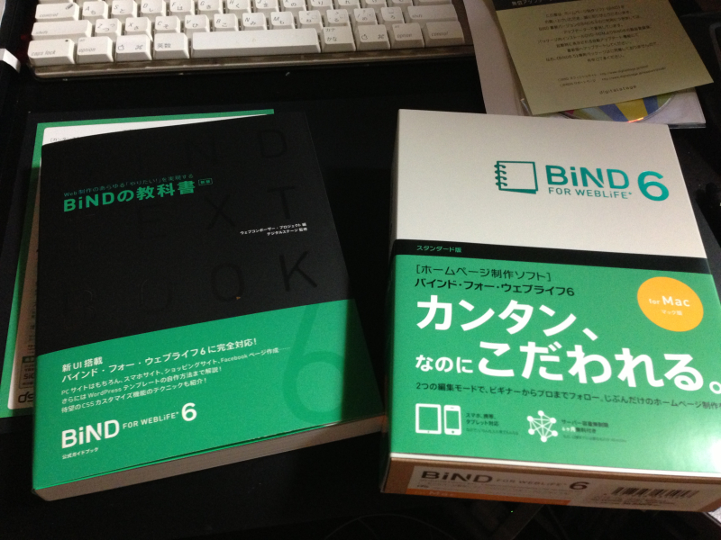 BiND6届きましたが、Macに光学ドライブがなかったのに気づく。 押し入れから昔使ってたドライブを引っ張り出し無事インストール完了。 これでやっとホームページの体験版表示が消せる。